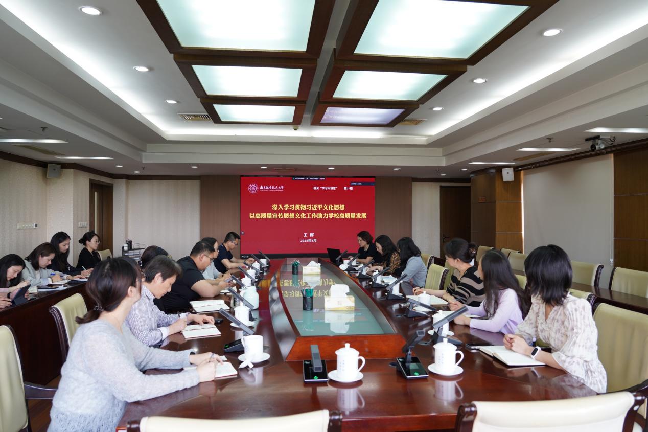 4月28日下午,第27期机关“学习大讲堂”在明故宫校区综合楼820会议室举行。本期邀请校党委常委、宣传部部长、教师工作部部长王晖面向机关全体教职工作“深入学习贯彻习近平文化思想 以高质量宣传思想文化工作助力学校高质量发展”专题辅导报告,报告会由机关党委书记焦宏图主持。活动通过线下主会场、线上分会场同步开展。