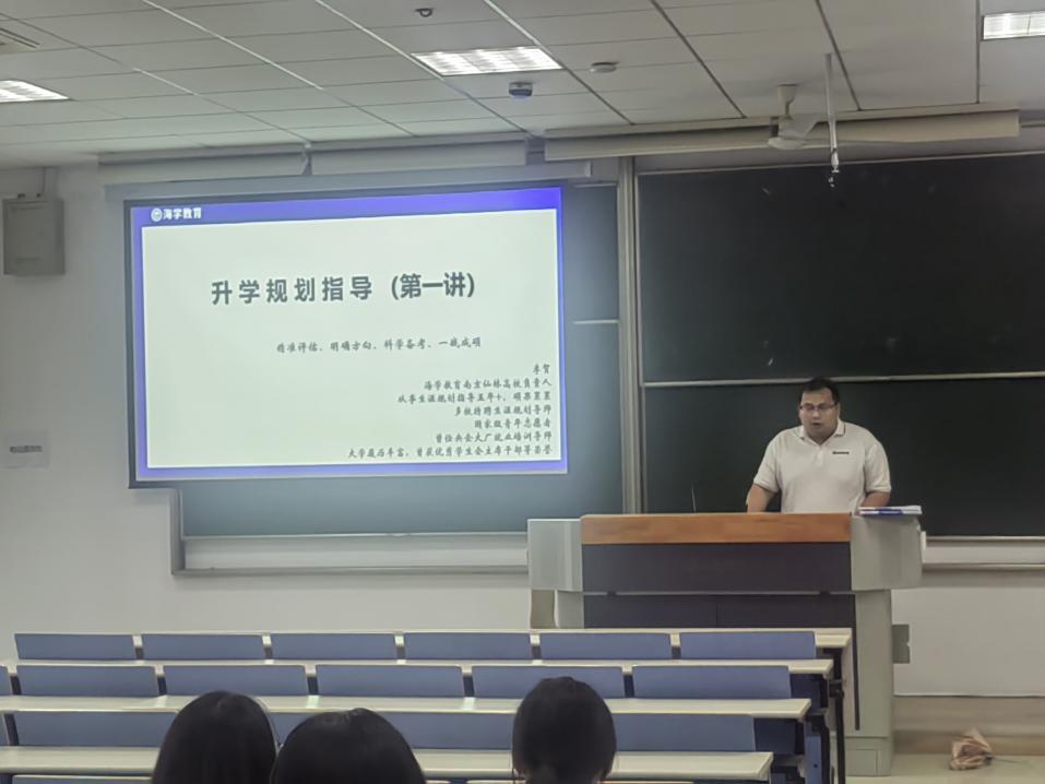 会上,海学考研资深讲师李贺针对当前考研形势及考研全科备考进行了讲解,叮嘱同学们要合理安排时间,制定详细的学习计划,分阶段进行复习。几何留学周魏魏针对英国、澳洲、香港等热门留学目的地的院校申请条件、专业选择、语言考试要求等内容进行详细解读,并结合同学的专业背景给出定制化建议。