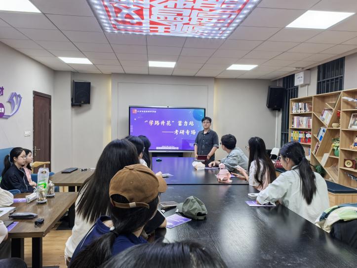 5月9日晚,“学路升花”蓄力站——考研专场主题沙龙在人文与社会科学学院104教室开展。本次沙龙邀请了2021级本科生周映红、钱一骏两位同学作主讲嘉宾,与同学们分享考研备考经验。本次活动由本科生辅导员李佳宁主持。