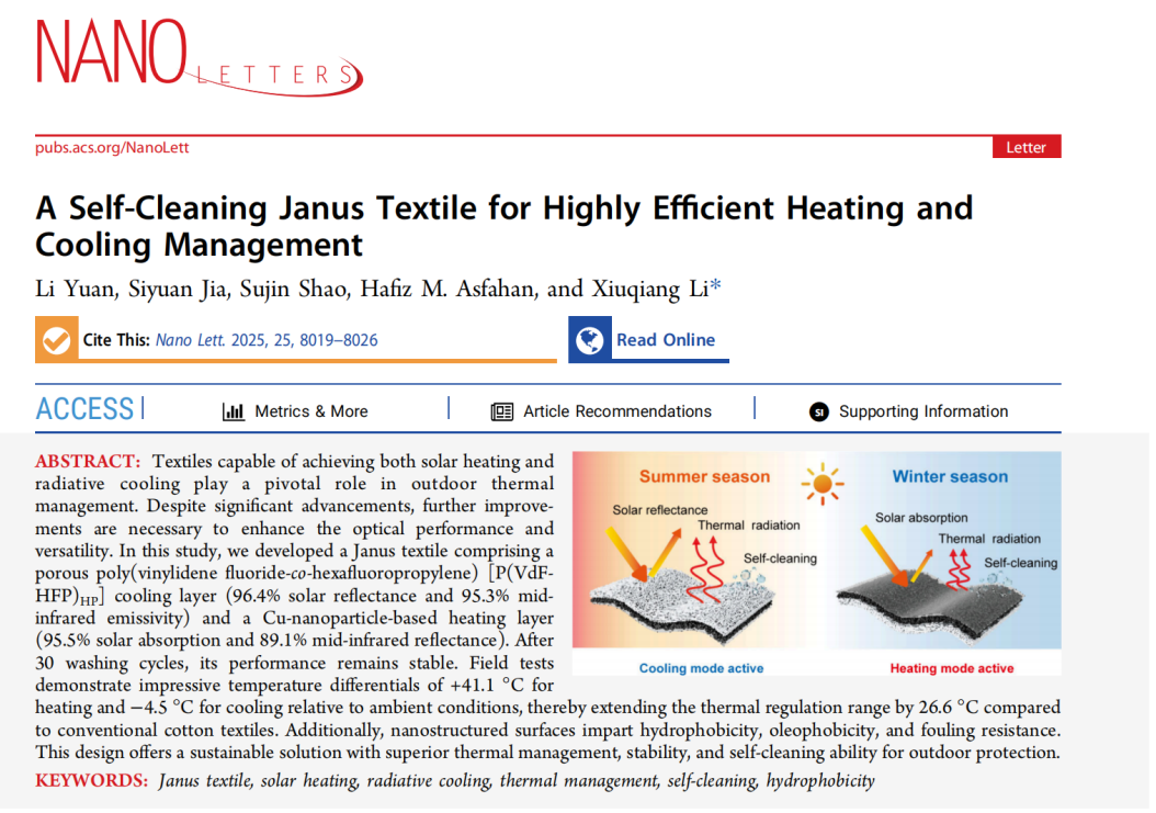 近日,南航国际前沿科学研究院郭万林院士团队李秀强教授在《Nano Letters》期刊上连续发表两篇重要研究成果。其中一篇研究聚焦于高热导率的二维共价有机框架(COF)薄膜,另一篇则探讨了一种具备高效加热与冷却管理能力的自清洁Janus纺织品。这两项研究成果为现代电子设备的热管理以及户外环境下的热舒适性提供了创新性的技术方案。