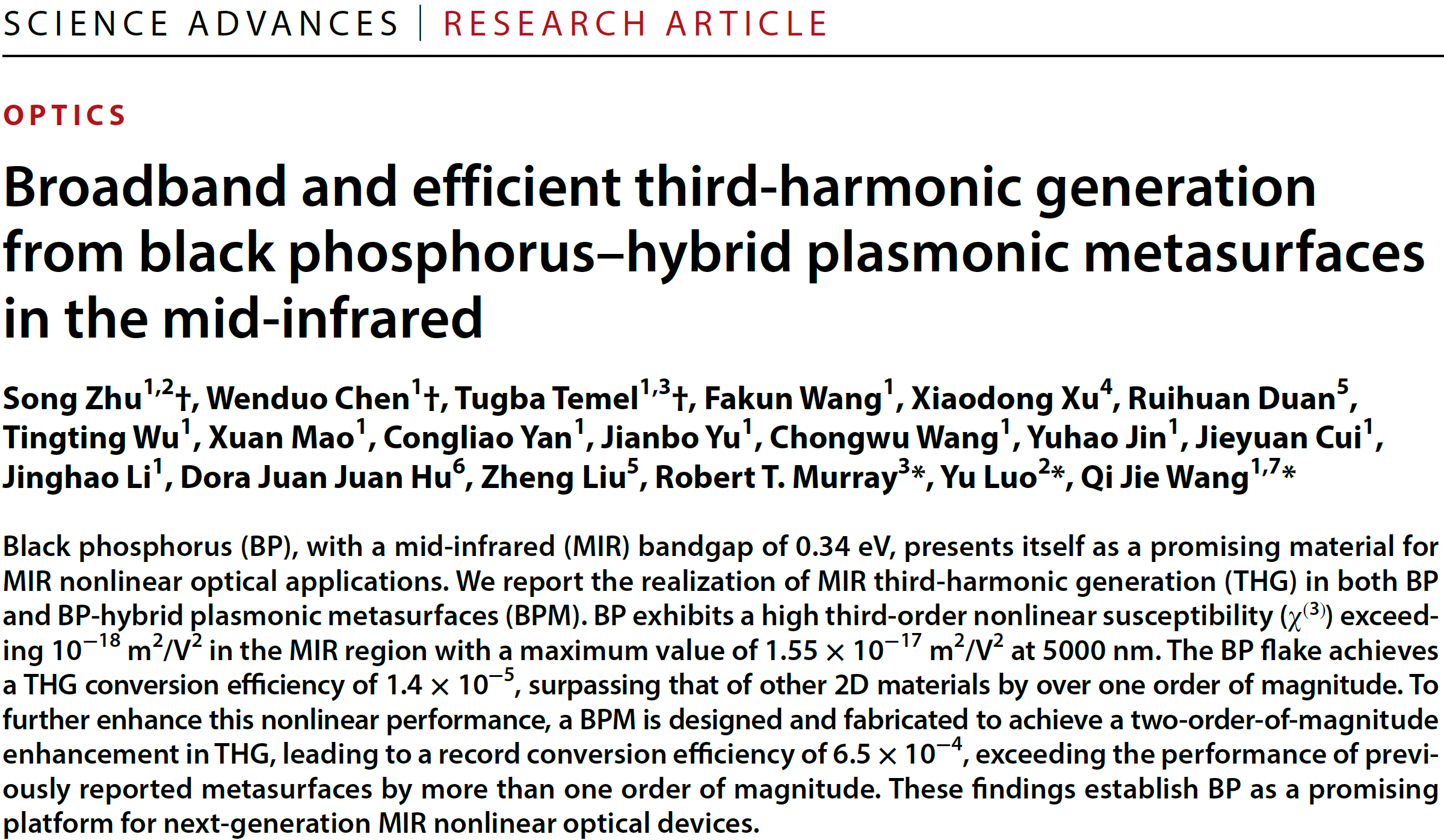 近日,我校电子信息工程学院罗宇教授团队联合新加坡南洋理工大学王岐捷教授和伦敦帝国理工学院Robert T. Murray教授在国际顶刊《Science Advances》上发表了一项突破性研究成果,成功利用黑磷(Black Phosphorus, BP)及其混合等离子体超表面(BPM),在中红外波段实现了宽带高效的三次谐波生成(Third-Harmonic Generation, THG),其转换效率创下历史新高。这一突破不仅填补了中红外非线性光学材料的性能空白,更为下一代超快光子器件、频率转换技术及集成光子学开辟了全新路径。王岐捷教授、罗宇教授和Robert T. Murray教授为该论文的通讯作者;我校朱松教授为论文的第一作者。