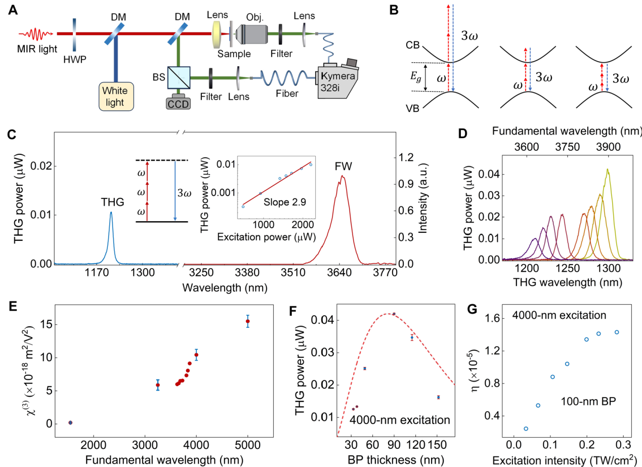研究团队首先揭示了黑磷在中红外的非凡本性。通过精密实验,他们测得黑磷在3000-5000 nm波段的三阶非线性磁化率(χ³)超过10⁻¹⁸ m²/V²,并在5000 nm处达到峰值1.55×10⁻¹⁷ m²/V²,较传统二维材料(如二硫化钼)提升1-2个数量级。在4000 nm激发下,黑磷的THG转换效率高达1.4×10⁻⁵,较单层石墨烯(3100 nm)提升六个数量级,创下二维材料新纪录。