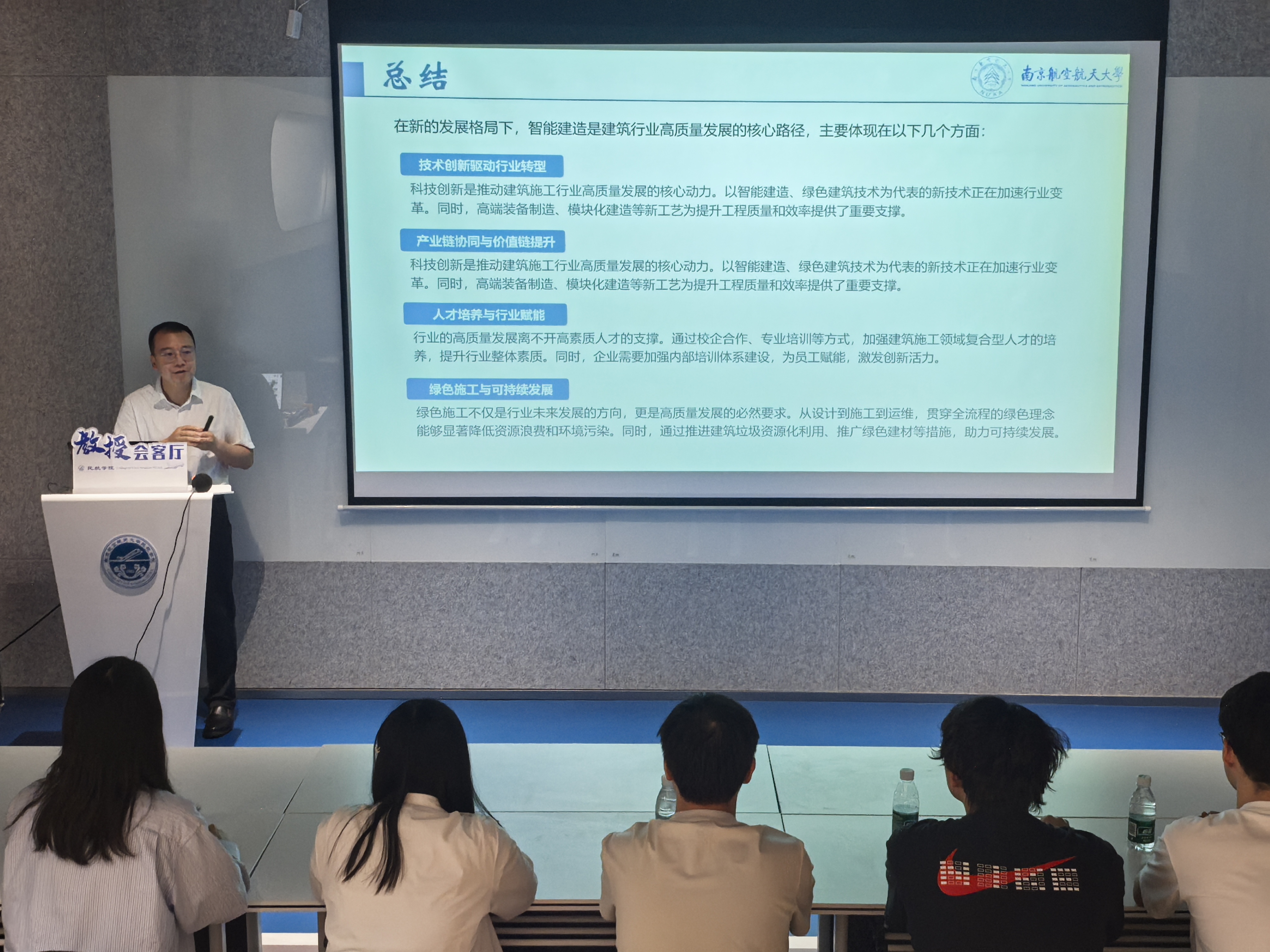 为深化专业认知教育,助力学生成长规划。5月14日,民航学院在天目湖校区“一站式”学生社区——智慧民航创新工坊举办“教授会客厅”活动,智能建造专业负责人、国家级高层次人才柯世堂教授以《智能建造专业发展与前沿》为题作专题讲座,国际创新港建设管理办公室主任杨杰、学院党委副书记王艳、副院长田勇、土木与机场工程系主任张锦华等教师与2024级智能建造专业本科生参加活动。