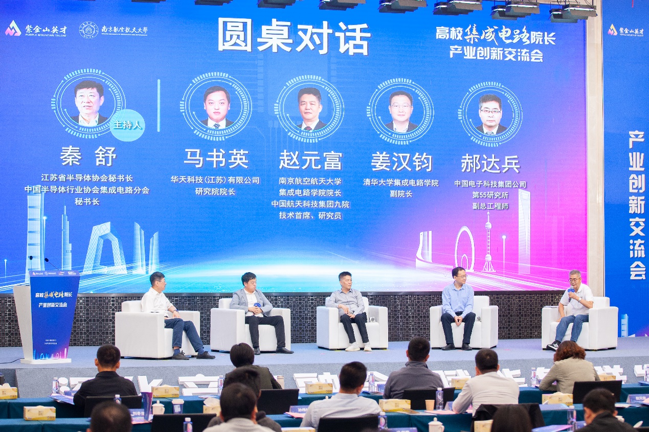 圆桌对话环节由江苏省半导体协会秘书长、中国半导体协会集成电路分会秘书长秦舒主持,我校集成电路学院院长、中国航天科技集团九院技术首席赵元富,清华大学集成电路学院副院长姜汉钧,华天科技(江苏)有限公司研究院院长马书英,中国电子科技集团有限公司第55研究所副总工程师郝达兵等围绕“深化产教融合,赋能集群发展”主题开展深度讨论。随后召开“集成电路产业创新赋能交流会”。