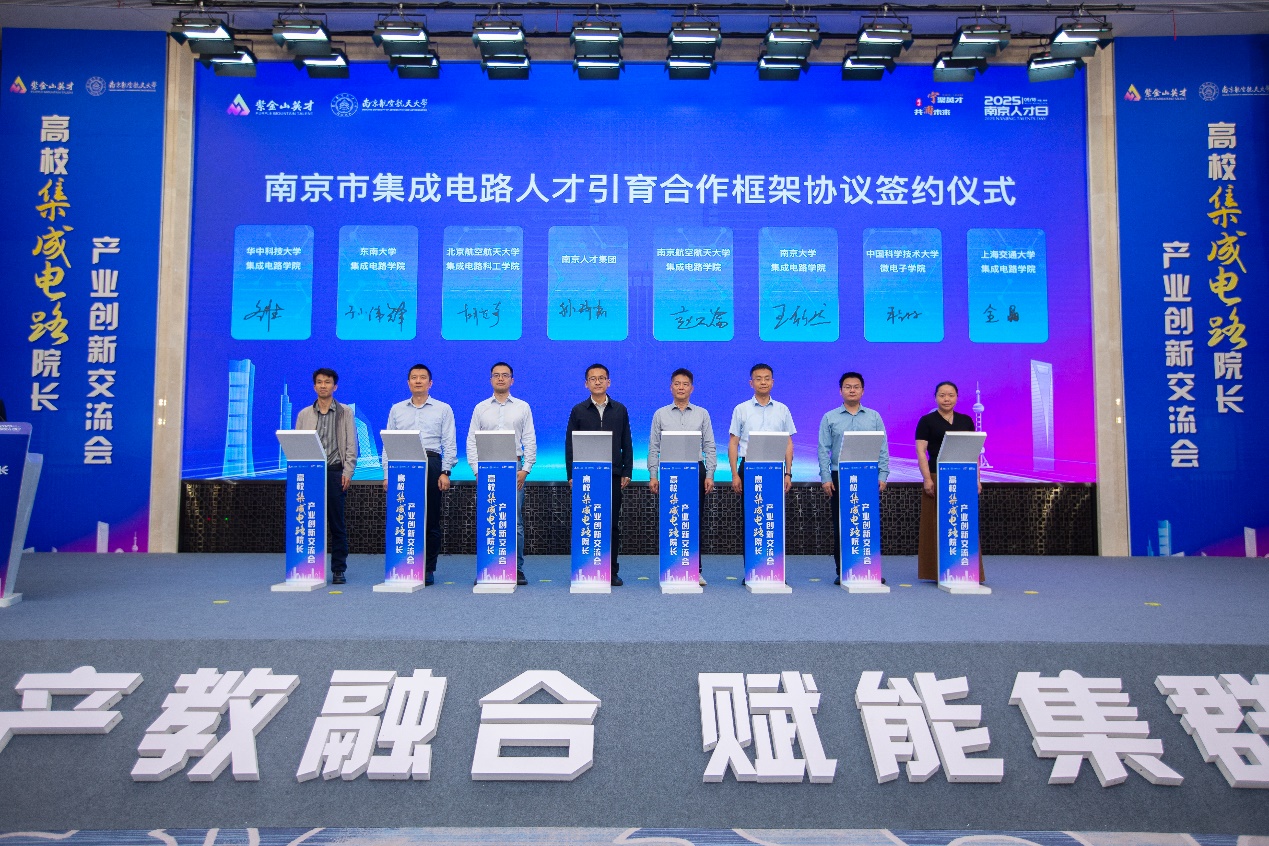 5月23日,2025年南京人才日系列主场活动之一,高校集成电路院长产业创新交流会在南京市浦口区举办。会议由南京市委人才办、南京航空航天大学、南京市发改委、南京人才集团主办。南京市委考核办副主任、市委人才办副主任陈美华,南京东南国资投资集团副总经理、南京人才集团总经理李志来,浦口区委常委、组织部部长王慧,我校党委常委、宣传部部长王晖出席活动并致辞。江苏省委组织部人才处、南京市发改委相关负责同志和我校集成电路学院相关负责同志参加活动。