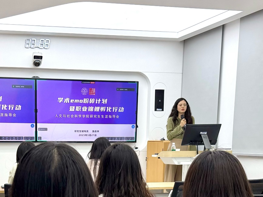 5月21日,人文与社会科学学院在院楼213智慧教室举办“职海扬帆·筑梦未来”职业生涯指导会。校就业创业指导服务中心张月铭老师、研究生专兼职辅导员以及2026届本研毕业生参与此次活动。