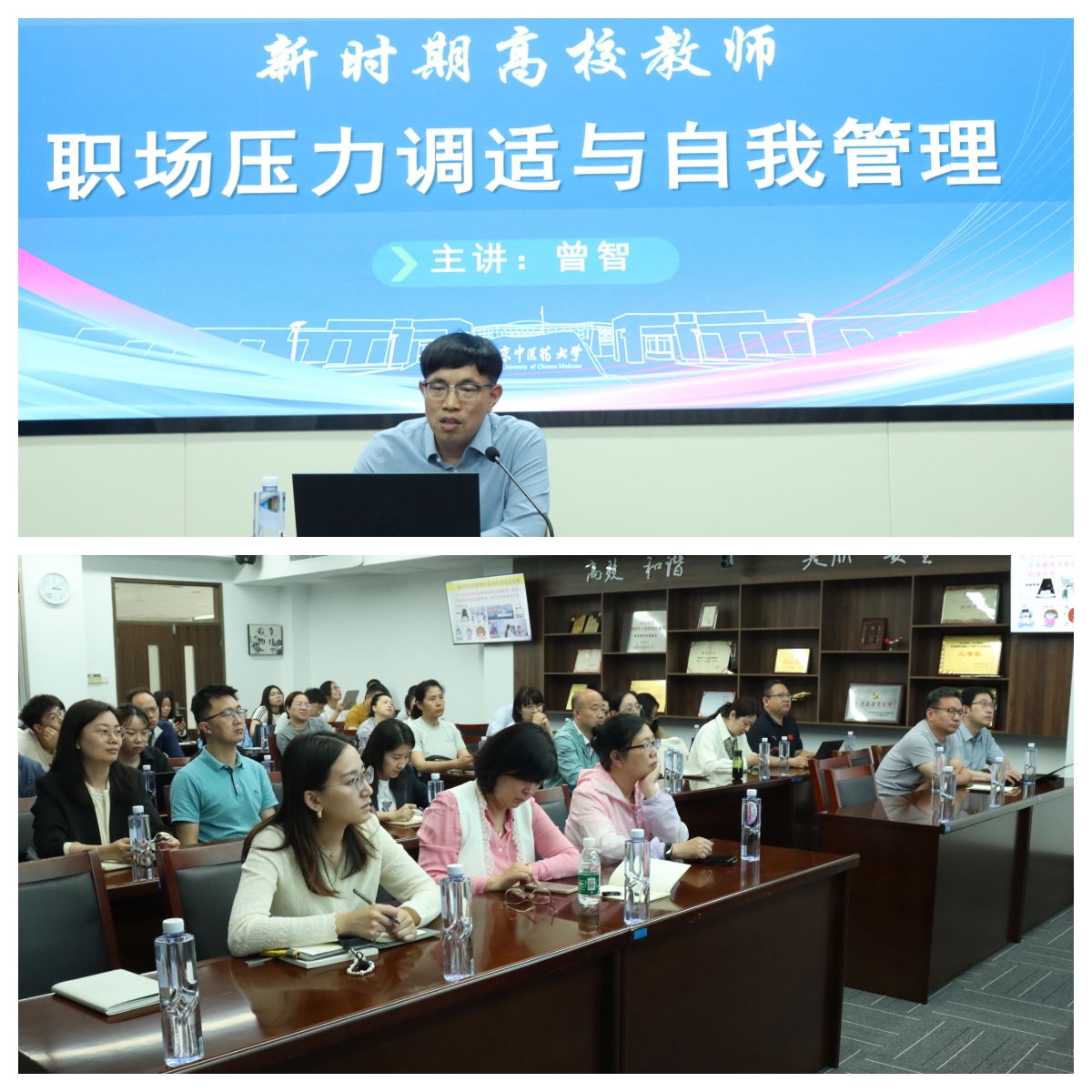 本次活动特邀南京中医药大学教授、博士生导师曾智担任培训嘉宾。“心理和谐是抵御职场内耗的核心免疫力。”曾智教授从传统文化与现代心理学视角,阐释心理调适智慧。通过案例演示“认知重构”“正念减压”“社会支持系统构建”等实操方法,为教职工提供了可落地的压力管理方案。