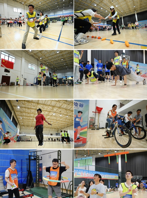 本届导学运动会共包含趣味运动会和导学游园会两个阶段。在趣味运动会阶段,三个项目依次拉开帷幕。“同心向党,力聚一绳”——多向拔河赛彰显了团结拼搏的必胜信念;“齐心协力,探宝争锋”——蒙眼寻宝赛展现出沉着冷静的探索精神;“跳跃梦想,绳舞青春”——集体跳绳赛演绎出协同共进的团队力量。在导学游园会环节,“趣味”与“健康”的理念相融,“欢乐”与“汗水”的体验交织。在“燃脂挑战岛”——高强度有氧区,同学们依次挑战腹肌塑形、跳绳竞速、静蹲耐力;在“暴汗探险谷”——器械训练区,同学们奋力角逐划船竞渡、燃脂骑行、呼啦圈持久赛;在“反应力工坊”——低冲击趣味区,同学们敏捷应对不倒森林、反应测试、眼疾手快;在“智享补给站”——科普恢复区,同学们专注体验体脂解析、拉伸指导,并品尝健康轻食。