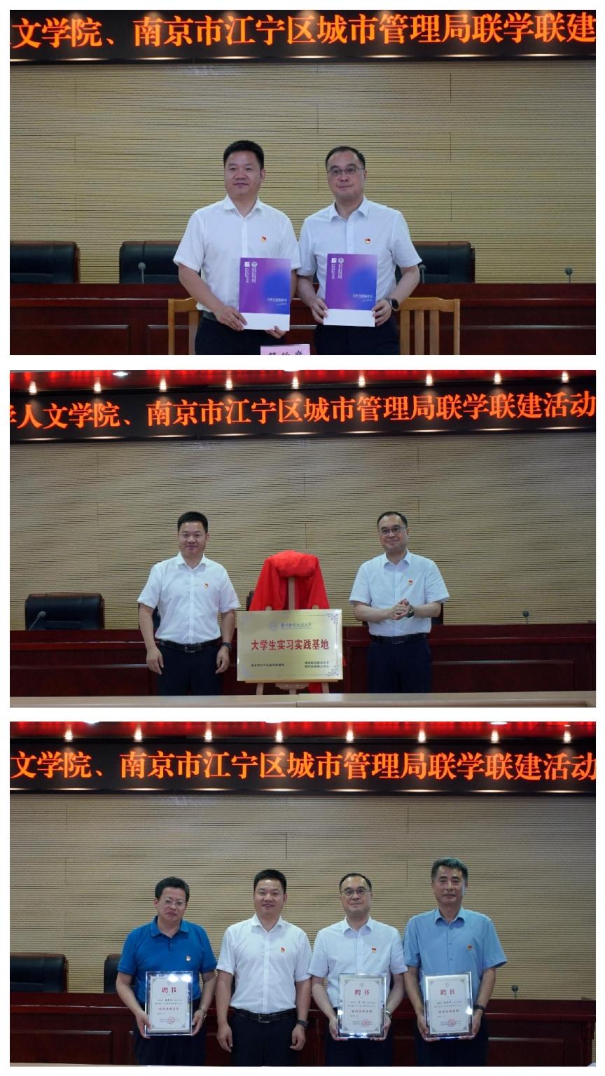 随后,双方签订合作共建协议书,人文学院院长高志宏与江宁区城管局党委书记、局长许刚共同为“大学生实习实践基地”揭牌,并颁发了校外实践导师聘书。