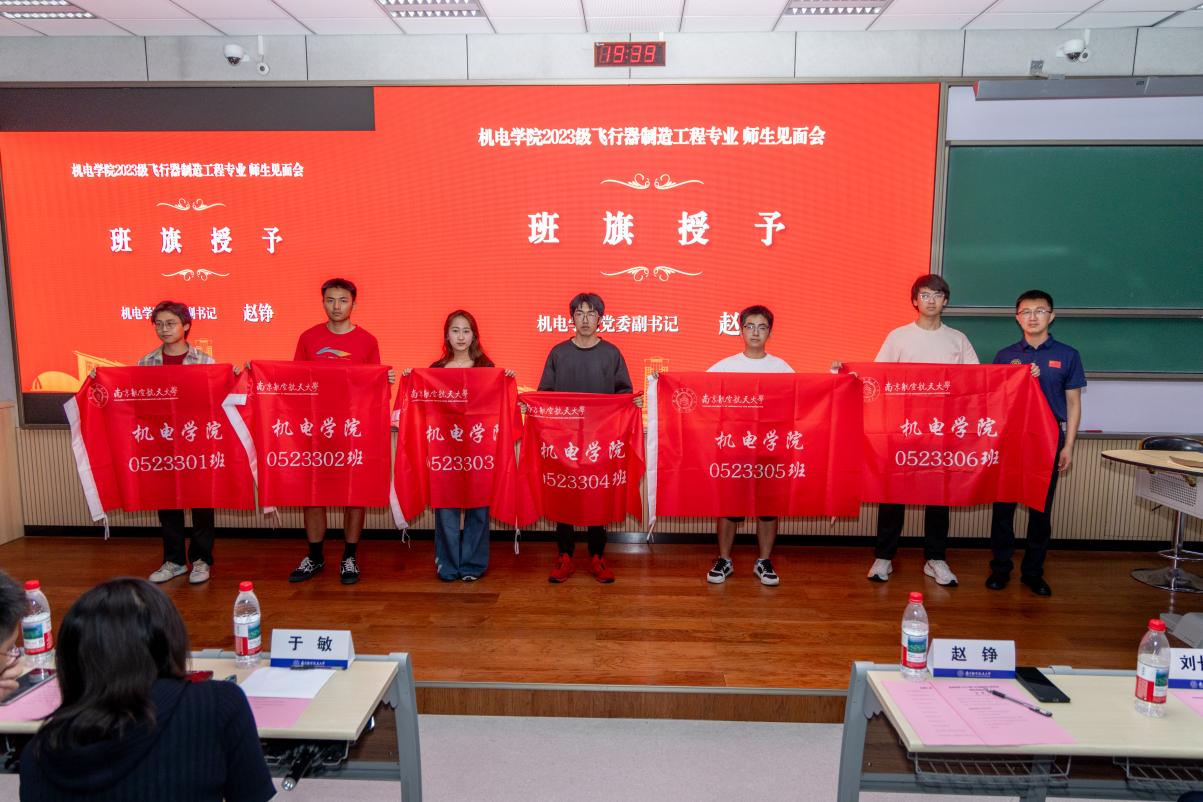 在庄严的进行曲中,赵铮为0523301至0523306六个班级授予班旗。“班旗是集体精神的图腾”,赵铮勉励学子,“希望你们以班为舟,在机电学院的海洋里扬帆远航”。