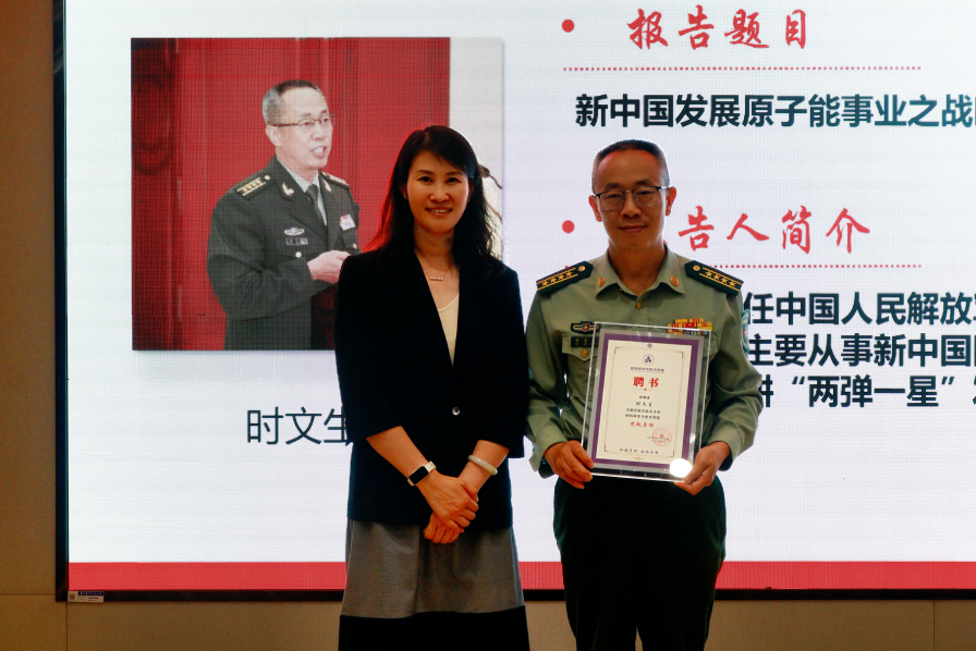 时文生主要从事新中国国防科技和武器装备史研究,深耕“两弹一星”发展史领域。课前,庄晓舒为时文生颁发“材料科学与技术学院思政导师”聘书。