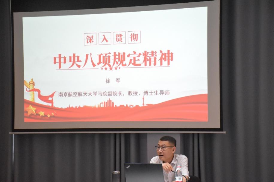 马克思主义学院副院长徐军教授为全体党员讲授了题为《深入贯彻中央八项规定精神》的主题党课。徐军紧密结合马克思主义哲学基本原理,深刻剖析了八项规定蕴含的哲学思想,精准阐释了其核心要义。他结合现实生活中的正反面典型案例,深入剖析了违反八项规定的严重危害,并着重强调了严守纪律规矩的极端重要性。他提到,学习贯彻中央八项规定精神,绝不能浮于表面条文,必须深入挖掘其丰富内涵与深远意义,全方位、多层次地把握其精髓。