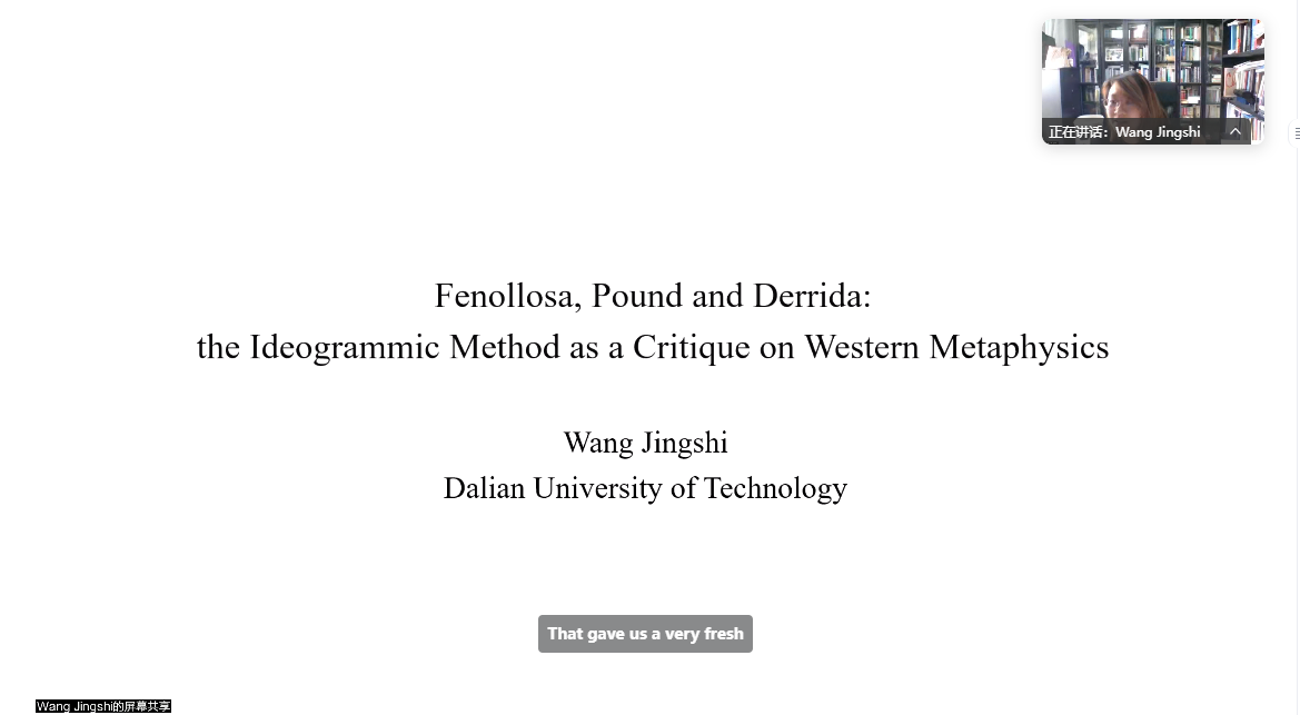 随后,王晶石副教授以“Fenollosa, Pound, Derrida: The Ideogrammic Critique of Western Metaphysics”为题,突破学科疆界,阐释汉字的动词性特质如何为解构西方哲学中关于“存在”的形而上学断言提供了独特视角。报告以费诺罗萨的表意文字法为核心,揭示其在艺术创作、认识论以及语言本体论层面的深远意义。