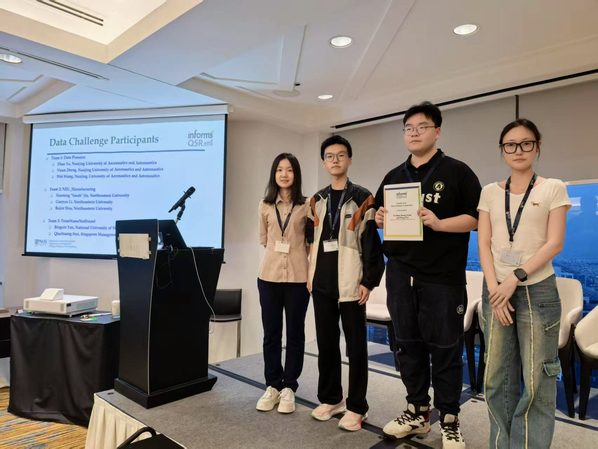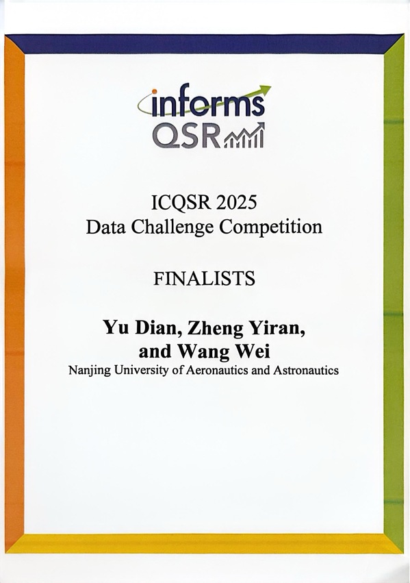 2025年运筹学与管理科学学会质量、统计与可靠性分会(INFORMS Conference on Quality, Statistics & Reliability, ICQSR 2025)于6月30日至7月3日在新加坡举行。该会议是全球运筹学和管理科学领域的顶级学术盛会,由国际运筹学与管理科学协会和新加坡国立大学联合举办。南京航空航天大学经济与管理学院学生郁典、郑伊然、王崴以初赛第二名的成绩(模型预测误差小,鲁棒性强)晋级本次分会数据挑战赛决赛,并荣获Finalist奖项。