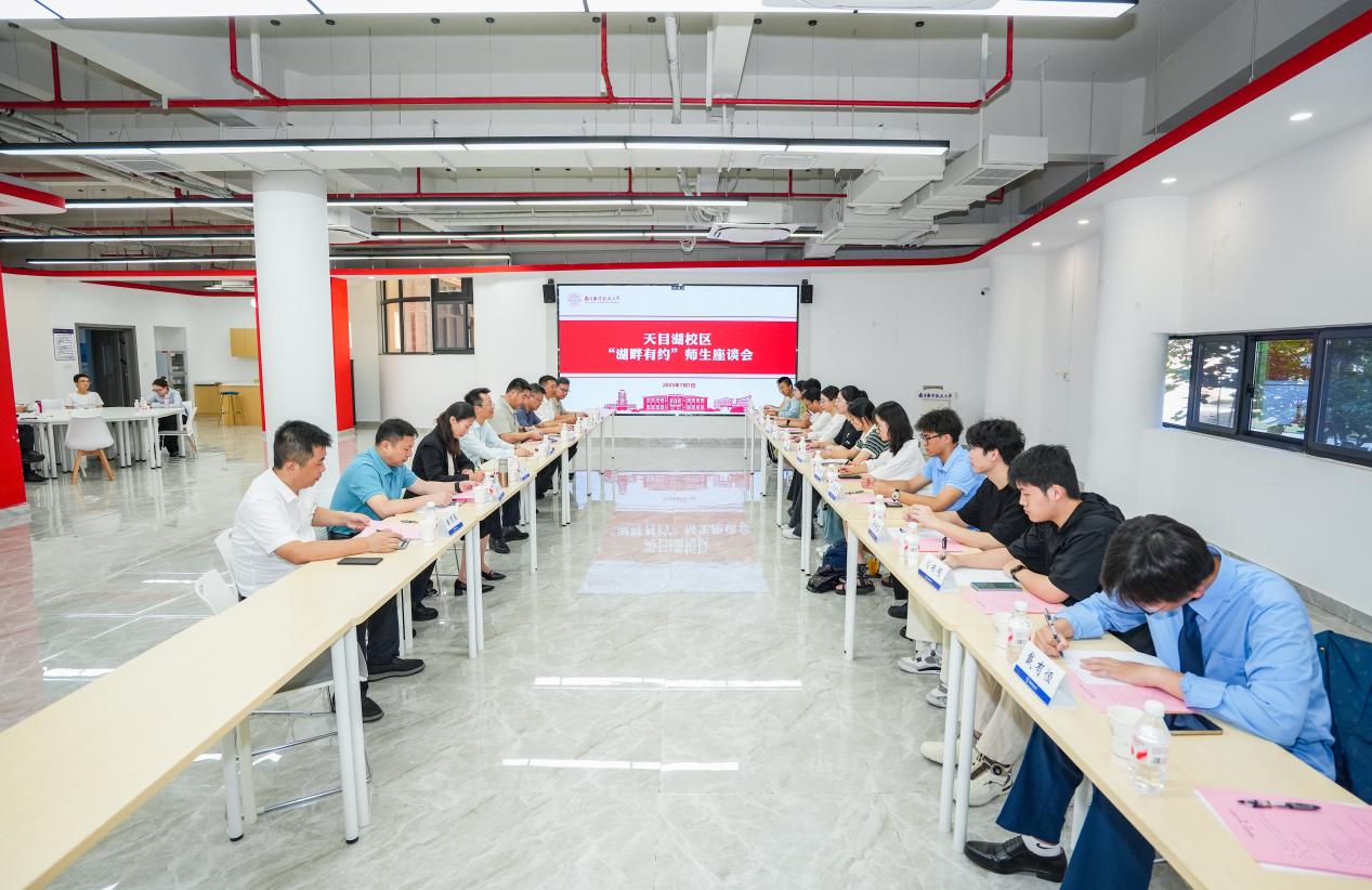 7月1日,天目湖校区在“一站式”学生社区召开“湖畔有约”师生座谈会,深入了解学生学习生活、调研学生成长需求、听取学生对校区发展的意见建议。校党委副书记刘宇雷,学校教务部、学生处、保卫处、天目湖校区管委会、后勤保障部等部门同志参加座谈会。