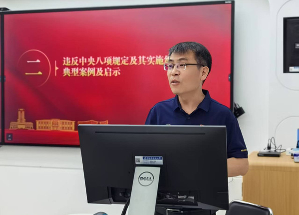 校纪委副书记、监察处处长、巡察办主任王国军讲授了题为《深入贯彻中央八项规定精神 以优良作风护航世界一流大学建设》的专题党课。他从深学细悟习近平总书记关于深入贯彻中央八项规定精神的重要论述、违反中央八项规定及其实施细则精神典型案例及启示、锻造作风优良的纪检监察铁军三个方面讲授党课。党课围绕六个鲜明提出,阐述了习近平总书记关于深入贯彻中央八项规定精神的重要论述,以及实施中央八项规定以来取得的伟大成就、带来的重大改变;通过警示案例的讲述,引导党员坚持以案为鉴、警钟长鸣,把纪律规矩内化为思想自觉和行动自觉;从作风是什么、建设什么样的作风以及作风怎么建设,提出了学校纪检监察干部队伍作风建设的目标和路径,要求大家严格落实“公、实、勤、俭、好”的理念,用实际行动践行纪检监察部门“忠诚担当、实事求是、敢于斗争、雷厉风行”的作风,以作风建设的新成效为世界一流大学建设清障护航。王国军还对在座的大学生党员就贯彻落实中央八项规定精神提出建议,希望他们严格要求自己,遵守校规校纪,带头勤奋学习,厉行勤俭节约,做好同学们的表率。