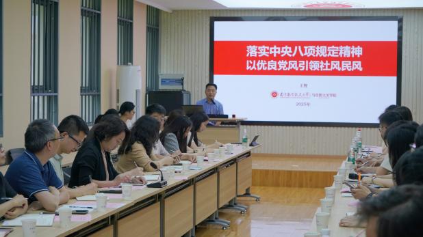 马克思主义学院院长王智以“落实中央八项规定精神,以优良党风引领社风民风”为题作专题辅导。他从历史维度和现实维度阐述开展深入贯彻中央八项规定精神学习教育的重大意义,回顾党在不同历史时期的作风建设成就与经验,并解析了当前加强党的作风建设的实践路径。