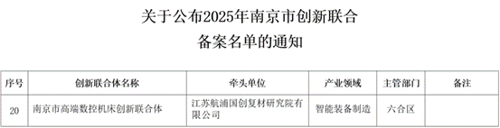 近日,南京市科学技术局公布了2025年市创新联合体备案名单,南航国际创新港孵化企业江苏航浦国创复材研究院有限公司(简称“航浦国创”)牵头申报的“南京市高端数控机床创新联合体”成功入选!为南京市高端装备制造产业注入强劲动能,助推构建产学研深度融合的产业升级新生态。