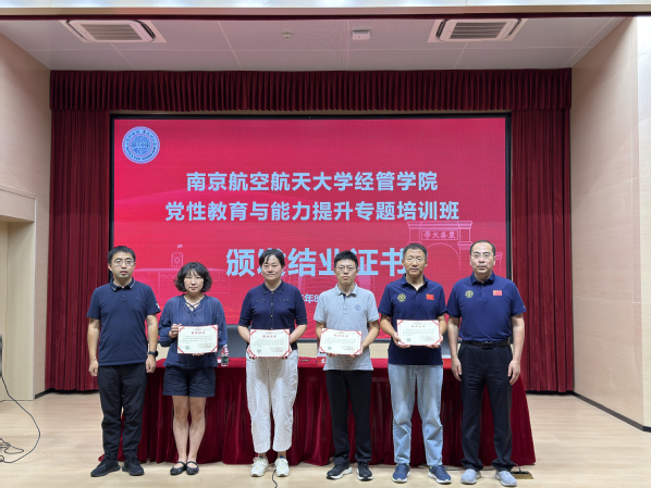 8月29日下午,举行了专题培训班结业仪式。何沙玮、马欢欢、董明华、韩茜作为学员代表依次发言,分享培训思考与工作规划。学院党委书记苏州、院长王群伟为学员颁发结业证书。苏州书记做总结讲话,强调要把培训成果转化为今后工作中改革创新、攻坚克难的生动实践,在观念上要更加解放思想,在方向上要瞄准标杆,在行动上要真抓实干,希望每一名经管党员都更加坚定地成为先锋示范,每个经管支部都更加自觉地成为坚强的战斗堡垒。