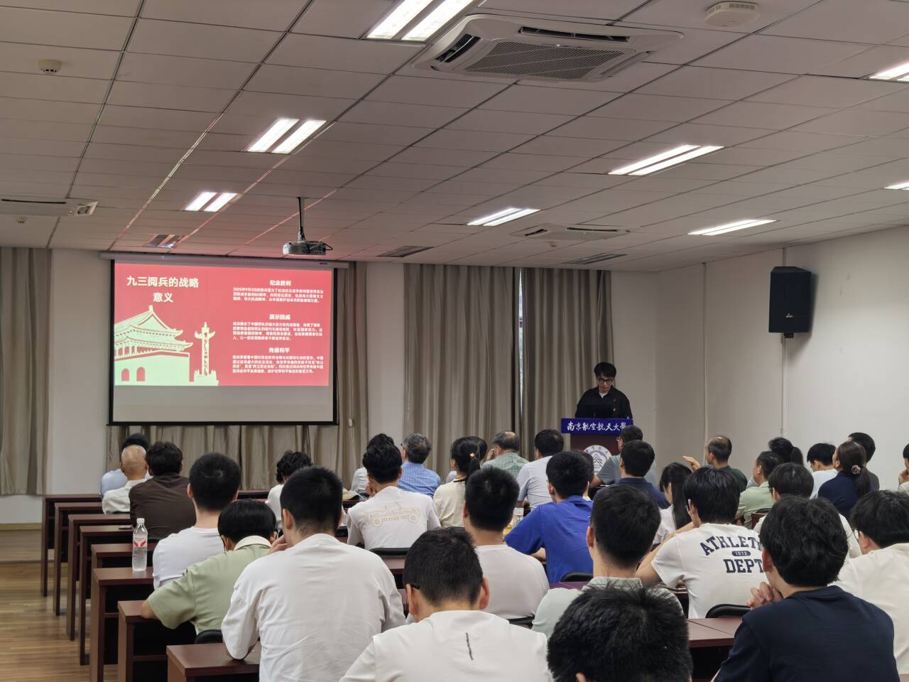院党委委员、教工党支部书记宋来收带领全体师生党员认真学习习近平总书记关于中国人民抗日战争和世界反法西斯战争的重要论述。他强调,习近平总书记的讲话为我们正确认识抗战历史、汲取前进力量提供了重要指引,每位党员都应铭记抗战历史,发扬抗战精神,践行航空报国使命,投身建设强国伟业,为实现中华民族伟大复兴的中国梦贡献航空力量!