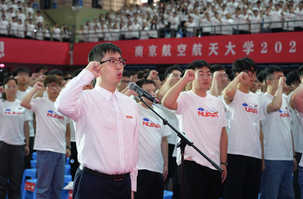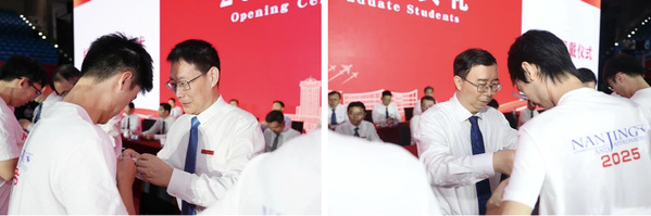 开学典礼在庄严的国歌声中拉开帷幕。全体校领导和嘉宾为2025级研究生新生代表佩戴南航校徽,台下全体新生共同佩戴校徽,宣告自己成为一名真正的南航人。