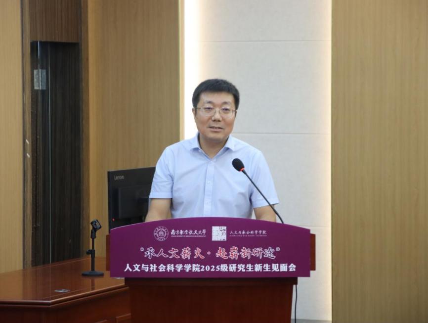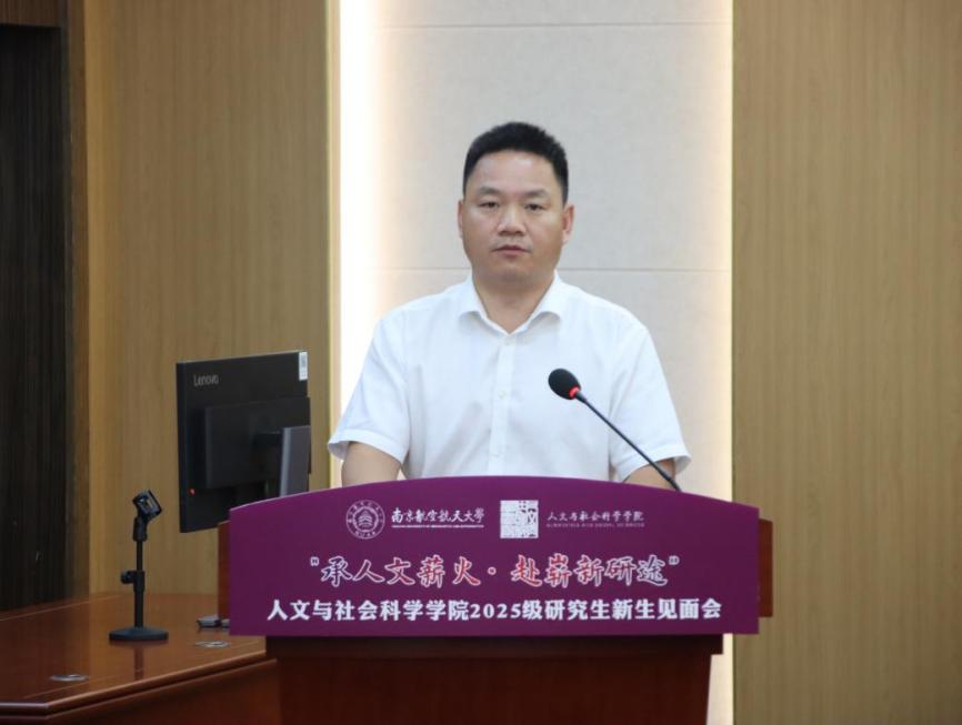 人文学院院长高志宏代表全院师生向2025级研究生新同学表达了热烈欢迎和诚挚祝贺。他围绕“爱校、爱院、爱己”三个关键词,通过勉励大家“以学校为荣,从南航的四次跨越中读懂使命担当”“以学院为家,在人文沃土中汲取成长力量”“以修己为基,在积极向上中书写精彩人生”,与同学们探讨了在未来的学习生活中,应该如何在南航人文这片沃土上找准定位、实现价值。