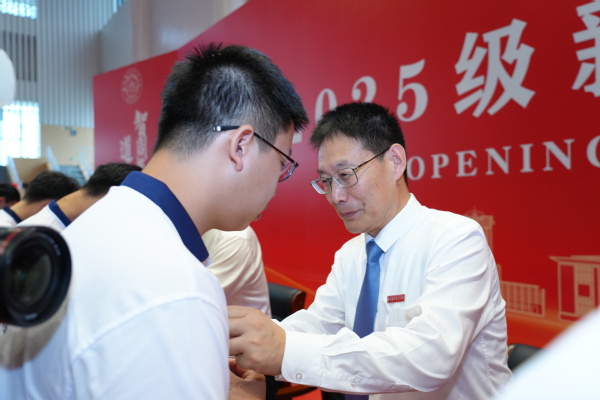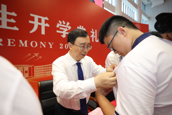 开学典礼在雄壮的国歌声中拉开帷幕。全体校领导和嘉宾为2025级新生代表佩戴南航校徽。台下全体新生共同佩戴校徽,宣告自己成为一名真正的南航人。