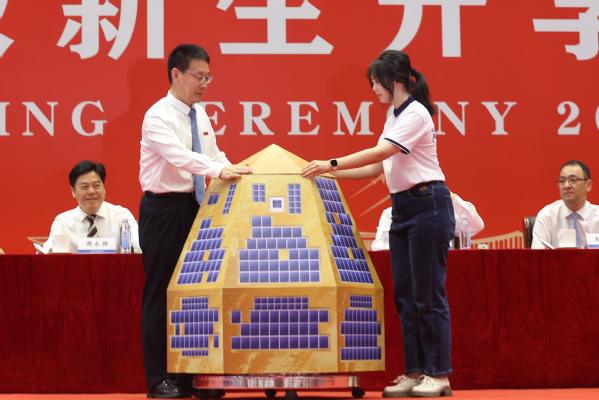 在迎新报到期间,学校精心组织了“致四年后的自己”主题教育活动,每位新生都把对未来的期盼与规划写成一封信件,投递到学校特制的时光胶囊中。典礼现场,校党委书记甄良与新生代表共同参与了“时光胶囊”封存仪式。“时光胶囊”外观设计源于我校自主研制的“天巡一号”微小卫星。“天巡一号”于2011年11月9日成功发射入轨,稳定运行四年,标志着南航实现了自主研制卫星的梦想。希望新生们传承前辈师生“脚踏实地,仰望星空”的精神,用实干实现梦想。