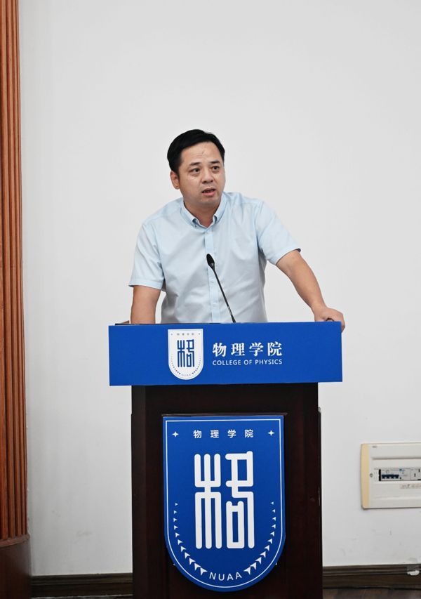 陈金宝传达了姜斌校长在第八届教职工代表大会第五次会议暨2025年下半年学校干部教师大会上的报告精神,结合学校发展蓝图,深入解读了学校在高质量党建、学科建设、人才引育、教学改革、科研创新等方面的整体部署。同时,他全面总结学院上半年工作成效,对标省内外强校精准剖析学院发展现状与短板,并系统部署十年规划实施方案:一是以基础教学为“主阵地”,推动教育质量从“教学大院”向“教学强院”跨越;二是以基础研究为“创新源”,聚焦支撑航空、航天领域原始创新突破;三是以交叉学科为“连接器”,深度贯通材料、控制、信息、动力等关联学科生态;四是以拔尖人才为“孵化器”,重点培育“物理+空天”复合型人才,为学校“双一流”建设与国家战略需求筑牢人才与创新根基。