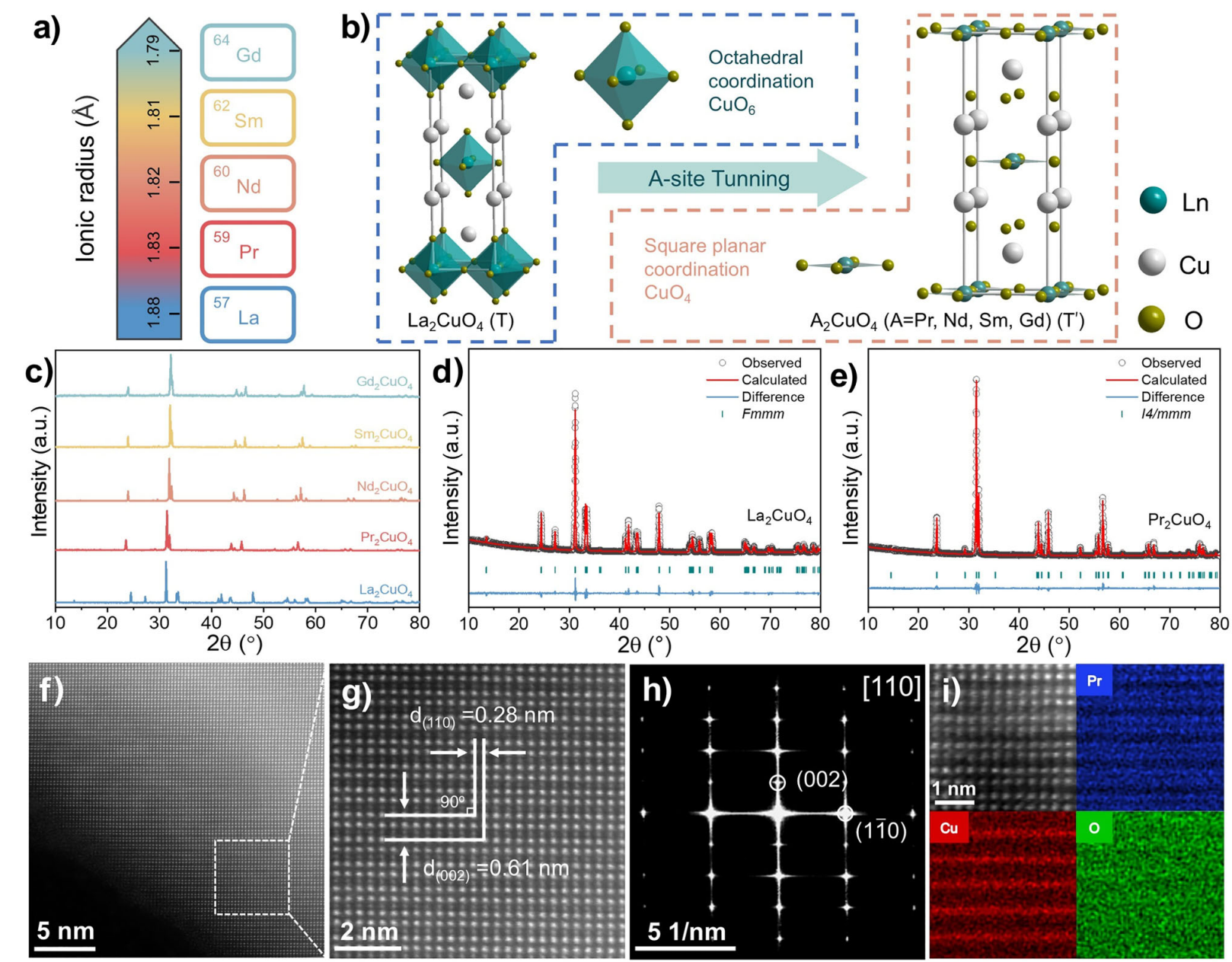 研究人员通过简单的A位调控策略设计和制备了一系列的层状铜酸盐(Ln2CuO4,Ln = La,Pr,Nd,Sm和Gd)中的Cu-O键极化率(图2)。XRD结果显示,所有的Ln2CuO4样品均成纯相,有趣的是,只有La2CuO4具有空间群为Fmmm的正交结构,归属于T相(K2NiF4型),Cu为八面体六配位;而其他Ln2CuO4样品表现出具有空间群为I4/mmm的四方结构,归属于T′相(Nd2CuO4型),Cu 为平面四配位(无顶氧)。AC-TEM和EDS分析进一步验证了Pr2CuO4的晶体结构和元素分布均匀性。SEM观察到样品呈现纳米颗粒聚集成较大块状的形态,且具有低比表面积。