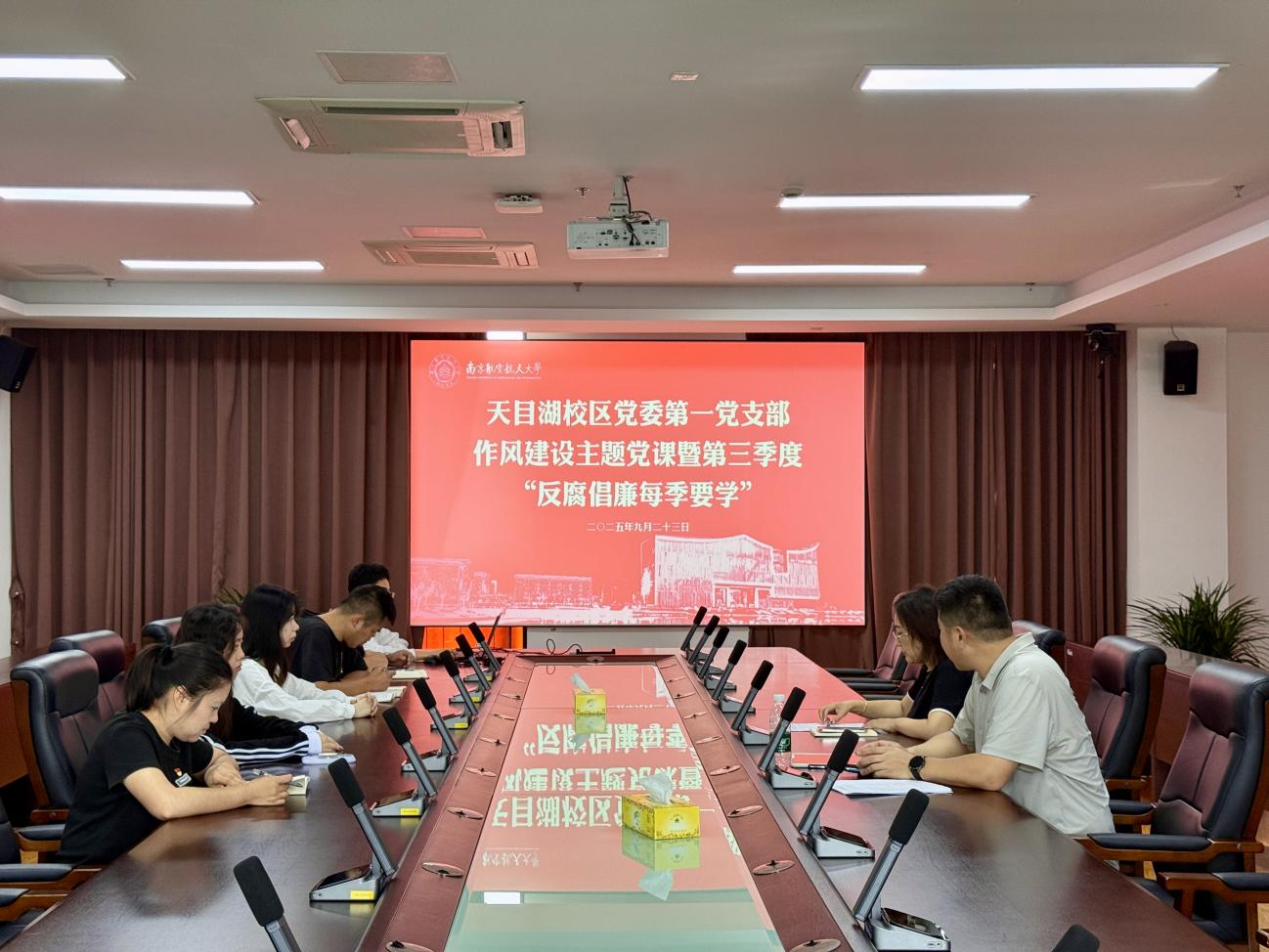 为进一步加强作风建设,9月23日上午,天目湖校区党委第一党支部开展作风建设主题党课暨第三季度“反腐倡廉每季要学”,支部书记寇晓洁主持会议。