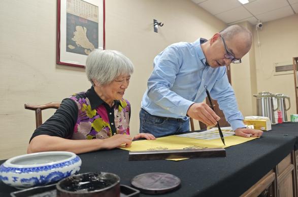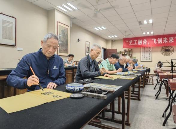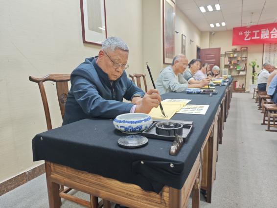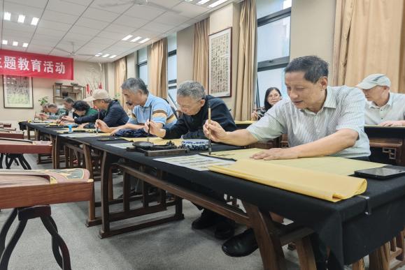 砚湖书院内,墨香四溢。在江苏省青年书法家协会副主席张星星的指导下,老教师们泼墨挥毫,亲身实践书法创作。只见他们凝神运笔,将“银龄子衿”“福寿康宁”等美好祝愿一一书于纸上。