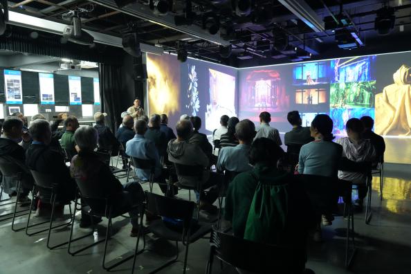 随后,老教师们前往艺术学院参观交流。在舞美工场实验室,大家跟随实验室主任范学智的步伐,不仅观看了学生作品,还通过虚拟仿真平台沉浸式体验了舞台美术的魅力,并对该实验室的建设历史与功能特点有了初步认识。移步至AR元宇宙创新区,在美术系党支部书记黄秋野的讲解下,老教师们亲身体验了AR增强现实艺术创作。此外,嘉宾们还走访了创意工场、数字音乐实验室等教学实践场所。艺术学院在艺术与科技融合方面取得的成果,给老教师们留下了深刻印象,他们纷纷表示,正是以工科为背景的大学,才能催生出如此深度的跨界融合。