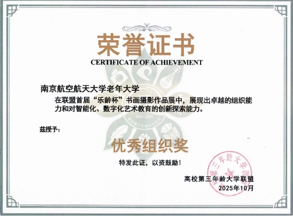 会议公布了第三年龄大学联盟举办的“乐龄杯”书画摄影作品展评奖情况。南航老年大学选送了作品13件,有 10件作品获奖,其中一等奖1项、二等奖7项,三等奖2项,南航老年大学荣获“优秀组织奖”。