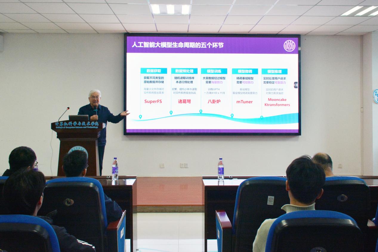 郑纬民从人工智能大模型的生命周期切入,系统介绍了从数据准备到模型应用的五个关键环节,并着重阐述了大模型在实际推理中的技术挑战与创新解决方案,让现场师生切身感受到人工智能大模型技术正日益走向普及化、实用化。