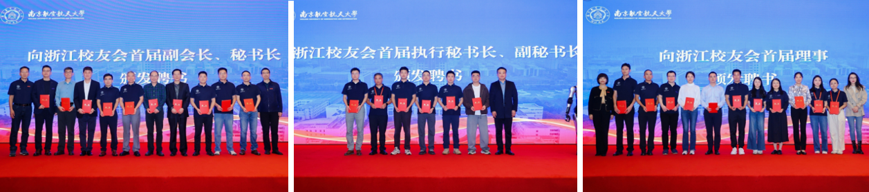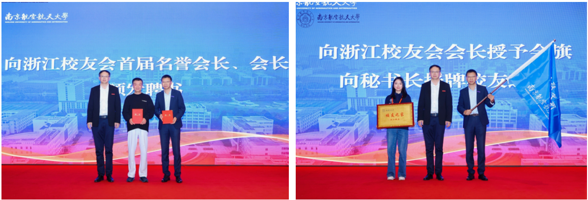 张启钱为新任名誉会长、会长颁发聘书,向浙江校友会授予会旗,并为“南京航空航天大学校友之家(浙江地区)”授牌。国际创新港建设办公室主任杨杰,浙江招生组组长、机电学院教授陈文亮为新任副会长、秘书长代表颁发聘书,李和新为新任执行秘书长、副秘书长颁发聘书,发展联络部副部长、校友总会副秘书长周佼佼,自动化学院党委副书记阙愚为新任理事颁发聘书。