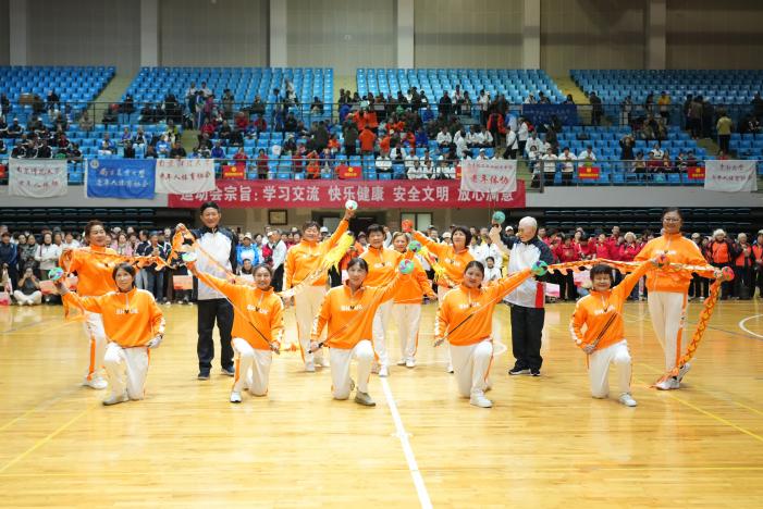 我校老同志在开幕式上表演了抖空竹和无极球。他们以灵动舒展的身姿生动诠释传统文化与现代体育的交融,展现昂扬向上的精神风貌。全体参赛运动员精神饱满、努力拼搏,赛出成绩、赛出团结、赛出风采。