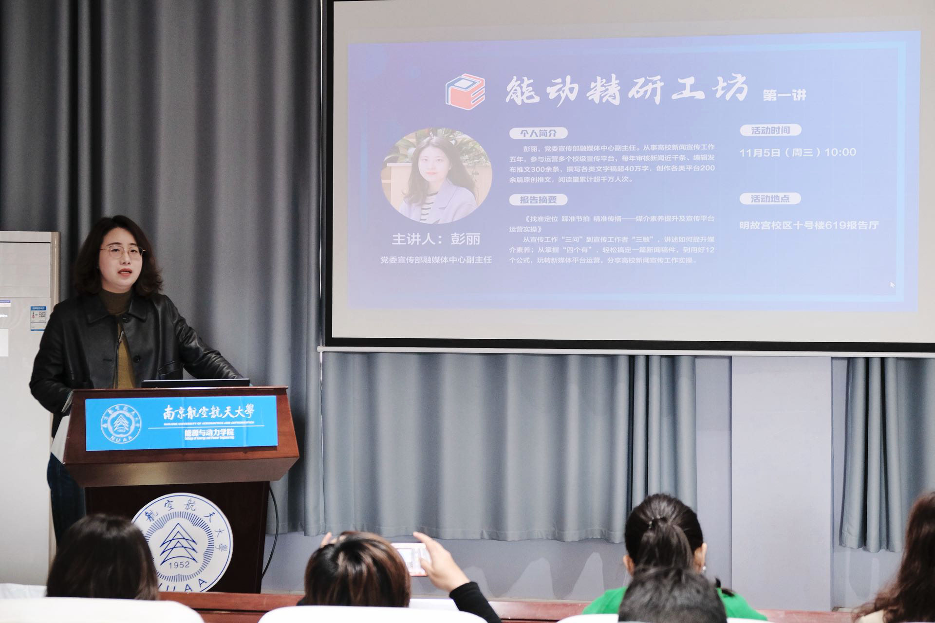 为切实提升师生媒介素养与宣传实践能力,筑牢学院宣传思想工作阵地,11月5日,能源与动力学院“能动精研工坊”首场培训正式开课,学院特邀校党委宣传部融媒体中心副主任彭丽开展专题培训。全体师生党支部书记、宣传委员,机关人员以及学生骨干参加培训。培训由院党委书记许静主持。