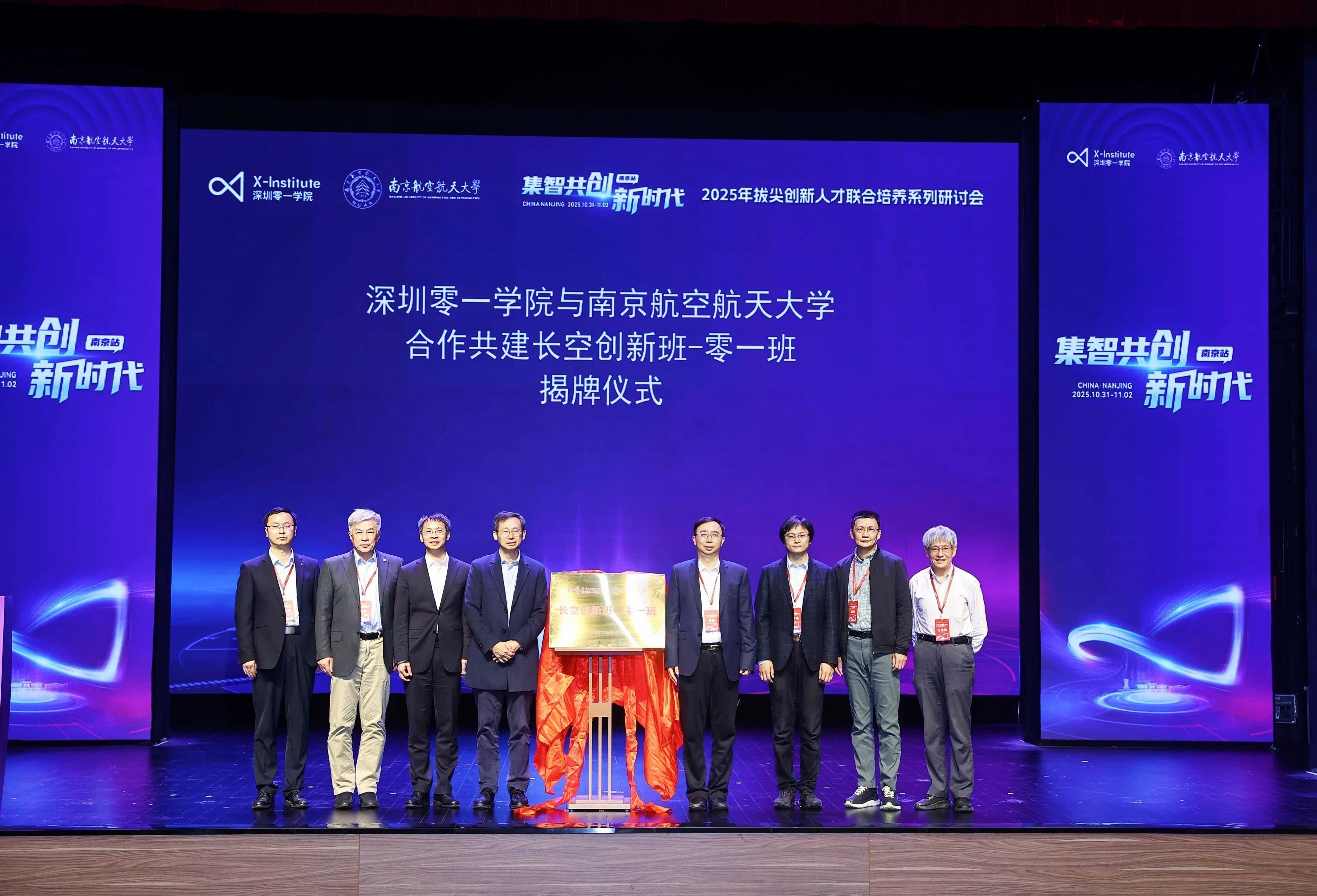 郑泉水与姜斌共同为“长空创新班-零一班”揭牌,深圳零一学院联合创始人徐芦平,清华大学陈民、任建勋及我校长空学院院长朱建军、首席导师熊克共同见证,标志双方联合培养迈入新阶段。