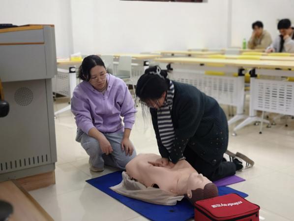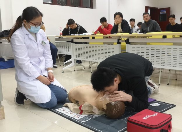 培训采用理论与实践相结合的方式,包括心肺复苏(CPR)操作、自动体外除颤器(AED)使用、气道梗阻急救等重点内容,实用性非常强。在教学现场,带教老师通过大量生动的案例分析和急救演示视频等,向学员们讲授了应急救护的法律依据、基本知识、原则、操作流程,并反复强调了操作要点和注意事项。实操环节,学员们在带教老师及校医院医务人员的指导下分别进行了CPR和AED的操作练习。