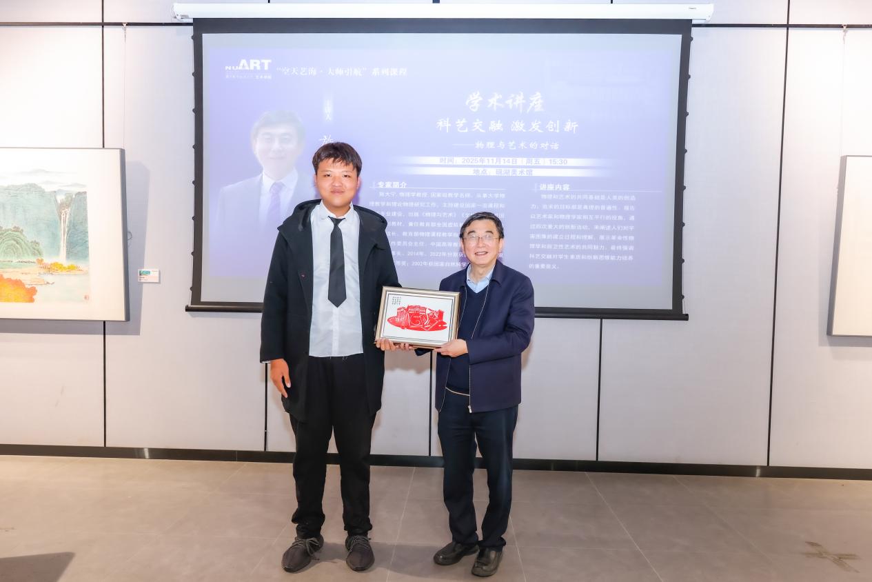 讲座现场,学生代表向施大宁教授赠送了由学院学生亲手制作的铜艺工艺品与剪纸作品,体现了艺术学子的专业素养与真挚敬意。