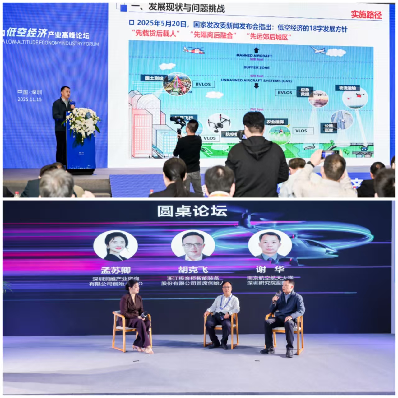 在高交会现场同步举行的第二届中国低空经济产业高峰论坛和 2025 年福布斯中国低空经济产业高交会专场活动上,研究院副院长谢华受邀发表《有人无人航空器低空协同运行的思考》演讲,并参加了圆桌论坛。在演讲和讨论中,谢华分享对低空经济战略背景下有人无人融合运行的发展现状、核心挑战与演进路径的思考,提出构建涵盖组织架构、协同机制、空域标准、数字底座的城市低空融合运行管理理论方法与技术体系,并介绍了南航在广东以及江苏省等地的初步实践成果,为低空经济的发展提供了新的思路和方向,赢得了与会专家和学者的广泛认可。