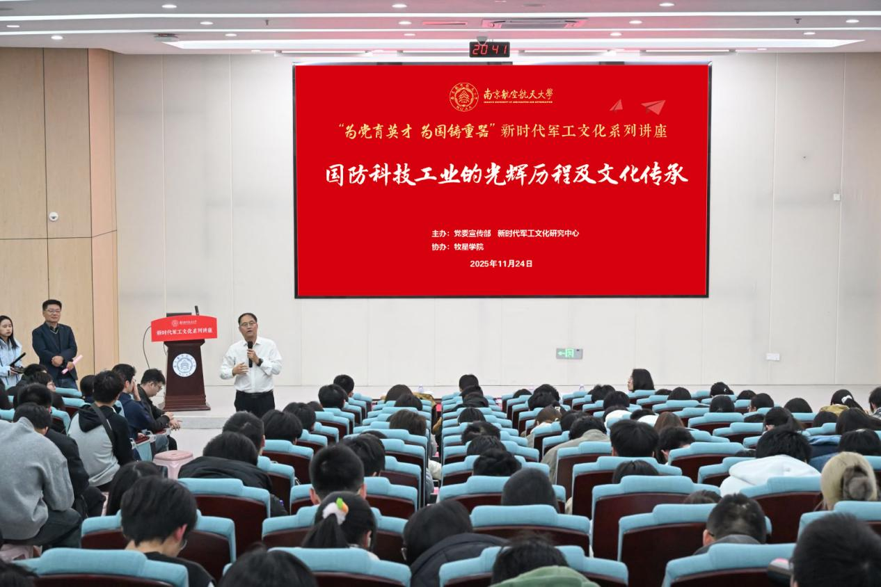 讲座上,刘存福受聘为南京航空航天大学“文化育人特聘专家”。聘任仪式结束后,刘存福系统回顾了我国国防科技工业从新民主主义革命时期至今的辉煌历程,并深刻阐释了贯穿其中的精神脉络。他指出,我国国防科技事业从战火中白手起家,在社会主义建设时期自力更生铸就了“两弹一星”等国之重器,在改革开放中开拓进取,最终在新时代实现了历史性跨越,迈向了高水平自立自强。这一部筚路蓝缕的创业史,也是一部忠诚奉献、自主创新、团结奋斗的军工精神传承史。最后,刘存福强调,必须传承弘扬以“坚持讲政治、人民至上、自信自立、守正创新、系统观念”为核心的军工文化,将宝贵的精神财富转化为驱动事业迈向新征程的强大引擎。