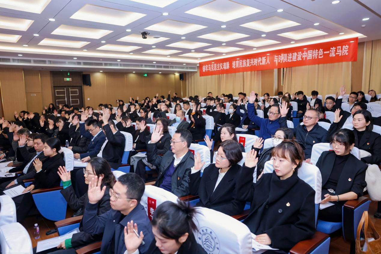 大会听取了学院党委书记何畏同志所作的《铸牢马克思主义魂脉 培育民族复兴时代新人 与时俱进建设特色鲜明的一流马院》工作报告,报告全面回顾了学院过去五年在党建引领、师资队伍、思政课教学、学科建设、人才培养等方面取得的显著成绩,系统总结了发展经验,深刻分析了面临的形势与挑战,明确了“一个目标、六大行动”总体思路,并对未来五年学院党的建设和事业高质量发展作出全面部署。