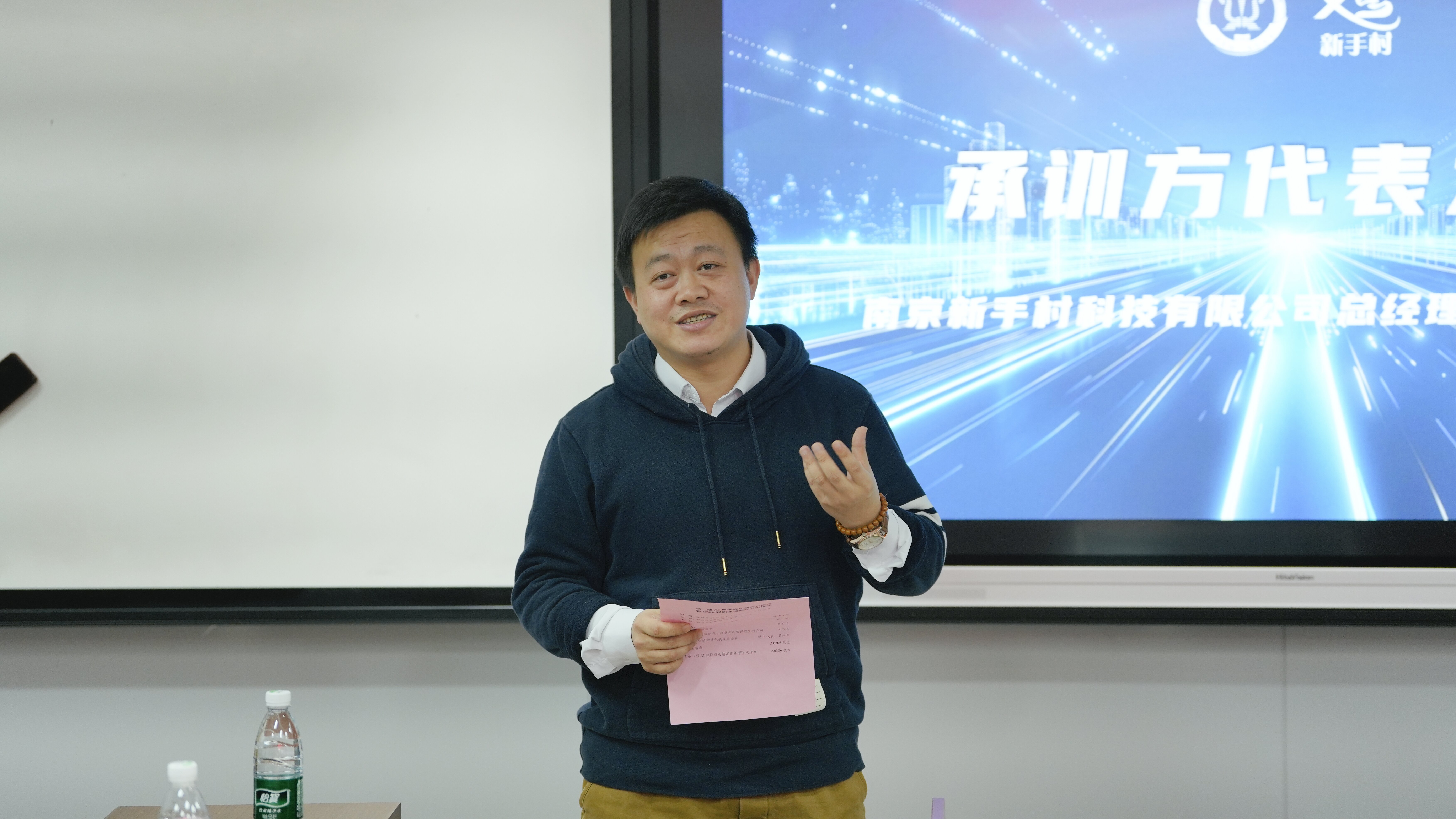 石新洪作为承训方代表发言。他强调,本期课程以“南京江宁旅游康养集团”真实项目为驱动,聚焦直播运营、数据分析、内容策划等实战方向,帮助学生从理论学习走向项目实操,真正实现“学以致用”。他进一步指出,参与训练营的学生将有机会在真实商业环境中锻炼策划、执行与复盘能力,提升就业竞争力与岗位适应力,为未来进入数字化新职业赛道打下坚实基础。