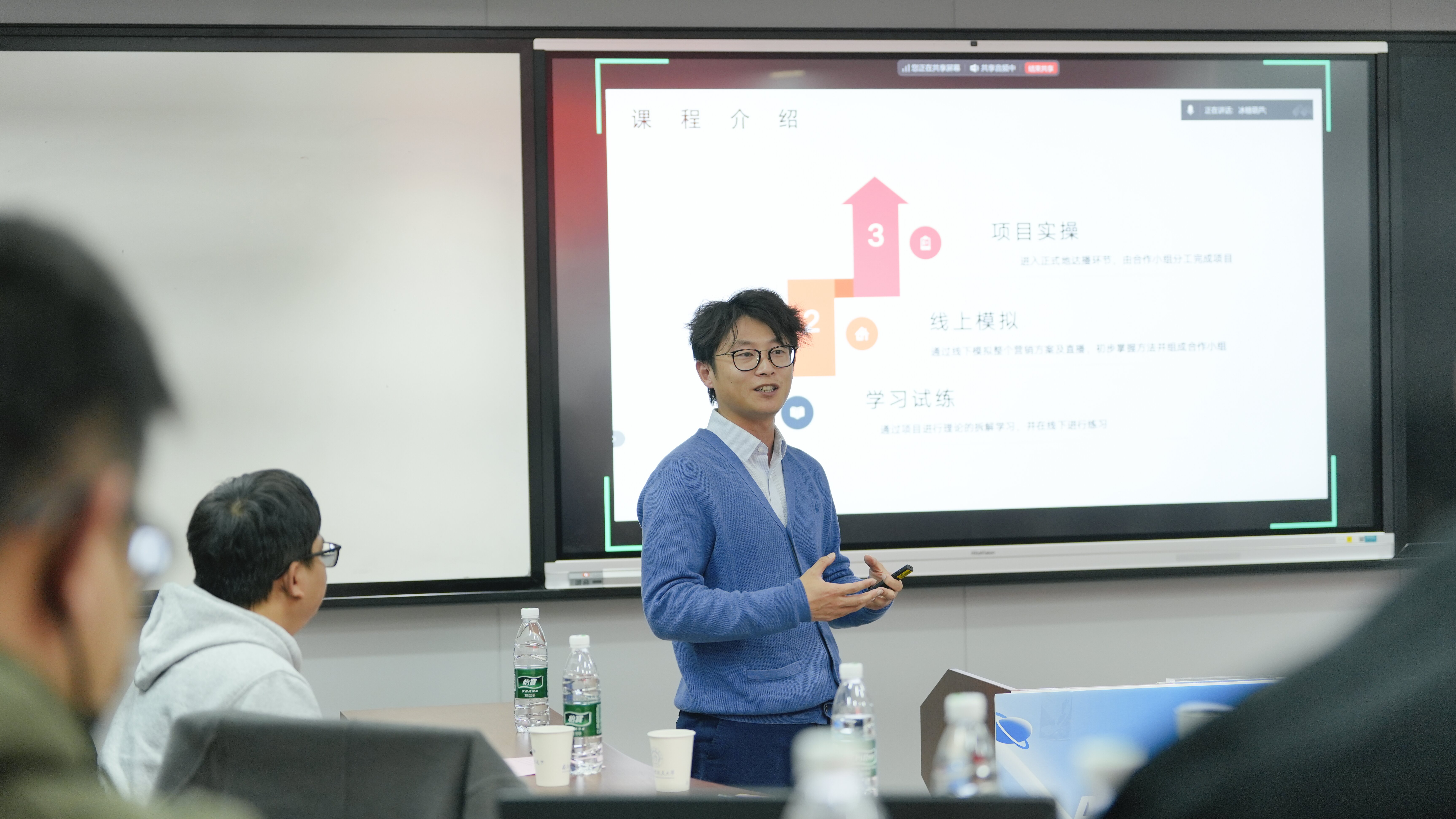 刘权震就本期课程设置与教学目标进行详细介绍。他提到,课程将围绕“项目策划—执行演练—项目提升—线上实践”四个阶段展开,涵盖产品拆解、直播话术、运营复盘等核心模块,通过“学—练—战”一体化的教学方式,助力学生独立完成全流程项目执行。