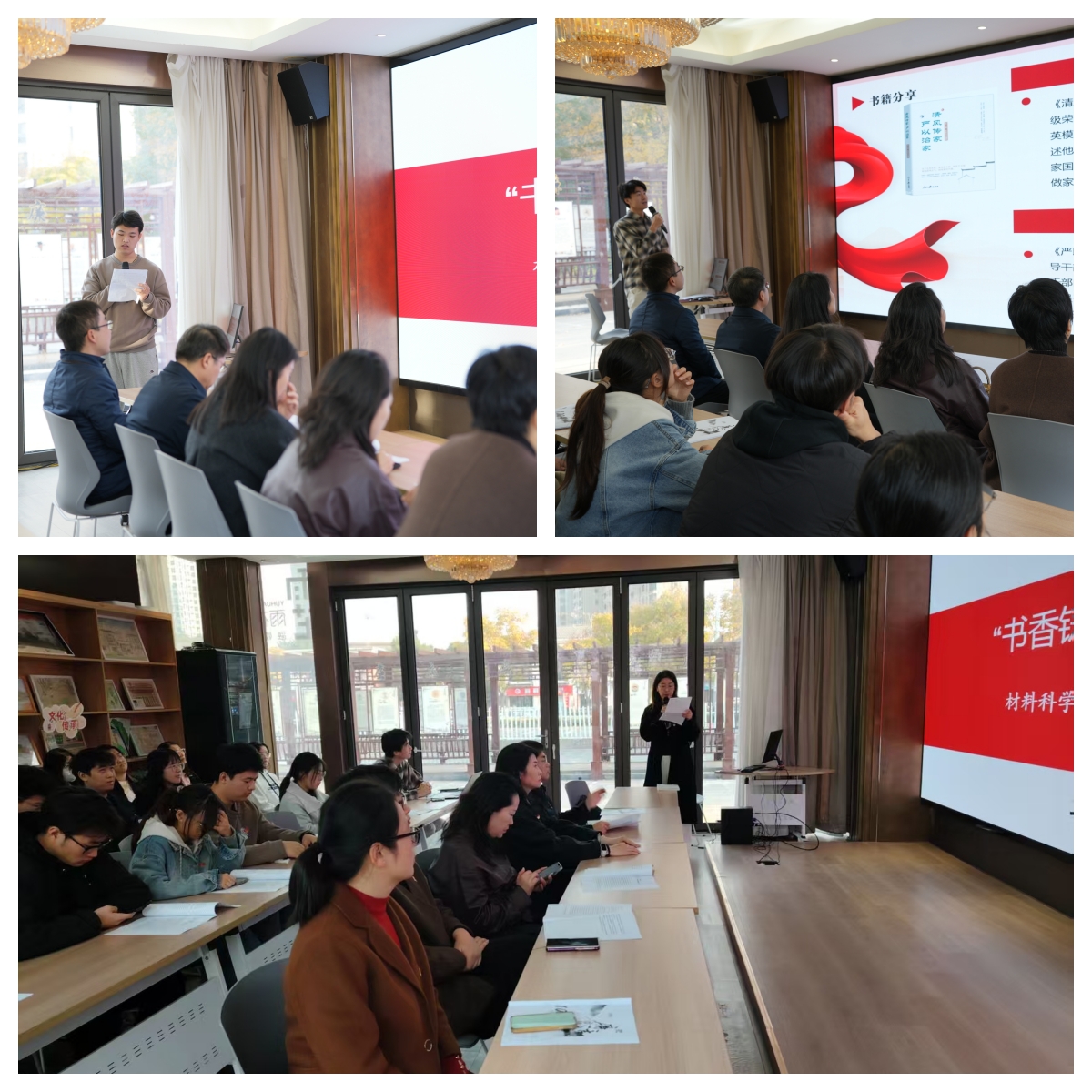 参观结束后,双方党支部就地组织了“书香铸廉韵”的读书分享会,分享会由图书馆第三党支部书记李小涛主持。首先,材料科学与技术学院本科生第一党支部书记吴一敌分享了阅读《清风传家严以治家》的心得,他谈到了家庭教育的重要性,并强调党员干部要见贤思齐,做到清廉自守,自觉做好家风建设的表率。随后,材料科学与技术学院本科生辅导员郭泽鹏分享了《把廉洁带回家:100位共产党人的故事》,重点介绍了彭湃、杨靖宇和朱德的故事,号召大家以榜样为镜,汲取精神力量,将廉洁的种子播撒在家庭和社会的土壤中。图书馆第三党支部姚胜译分享了《党员干部“八小时外”100条纪律红线》和《中国共产党廉政史讲义》两本书。她详细解读了党员干部在“八小时外”应遵守的纪律规矩,并结合党的廉政建设历史,系统梳理了我们党反对腐败、建设廉洁政治的坚定决心和光辉历程,使大家对党的纪律建设和廉政史有了更全面、更深刻的理解。