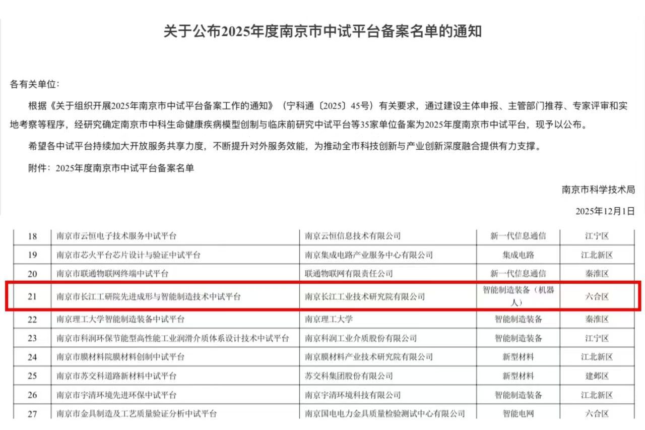12月1日,南京市科学技术局正式公布了《2025年度南京市中试平台备案名单》,南航国际创新港“南京市长江工研院先进成形与智能制造技术中试平台”喜获上榜!
