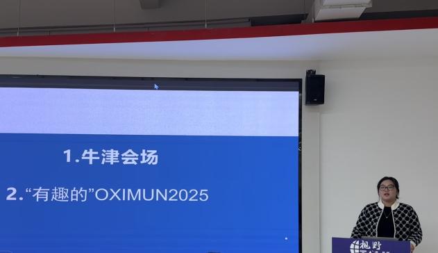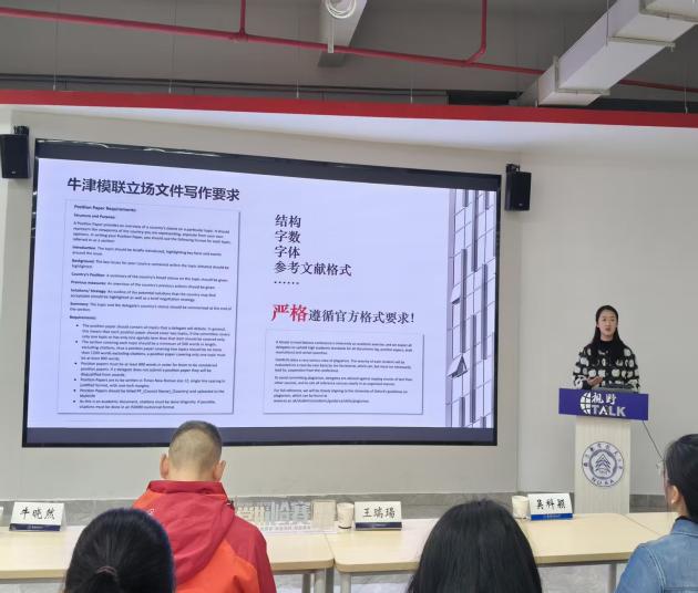 首先,教师牛晓然为同学们进行了有关模联前期培训与准备的关键要点的深度解读。牛晓然从模联的含义及概况、为什么我们要去参与模联、在模联中的收获以及模联的运作机制的几个方面为同学们构建起对模联的初步认知体系。同时,牛晓然也向同学们展示了有关本次牛津模联的珍贵影像,强调了模联对同学们进行提升批判性思维,提升个人思考能力的巨大作用。