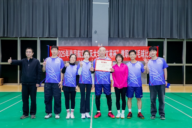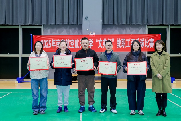 经过激烈角逐,最终能源与动力学院代表队脱颖而出,蝉联了教职工羽毛球比赛冠军,经济与管理学院-艺术学院联队夺得亚军,后勤保障部获得季军。外国语学院-通用航空与飞行学院联队、自动化学院、机电学院、物理学院、航空学院+航天学院联队分列第四至第八名。张钟勤、王伟、邬沛雄和校工会副主席徐梦洁分别为获奖代表队颁发了奖项。至此,2025年南航“文苑杯”教职工羽毛球比赛圆满落幕。